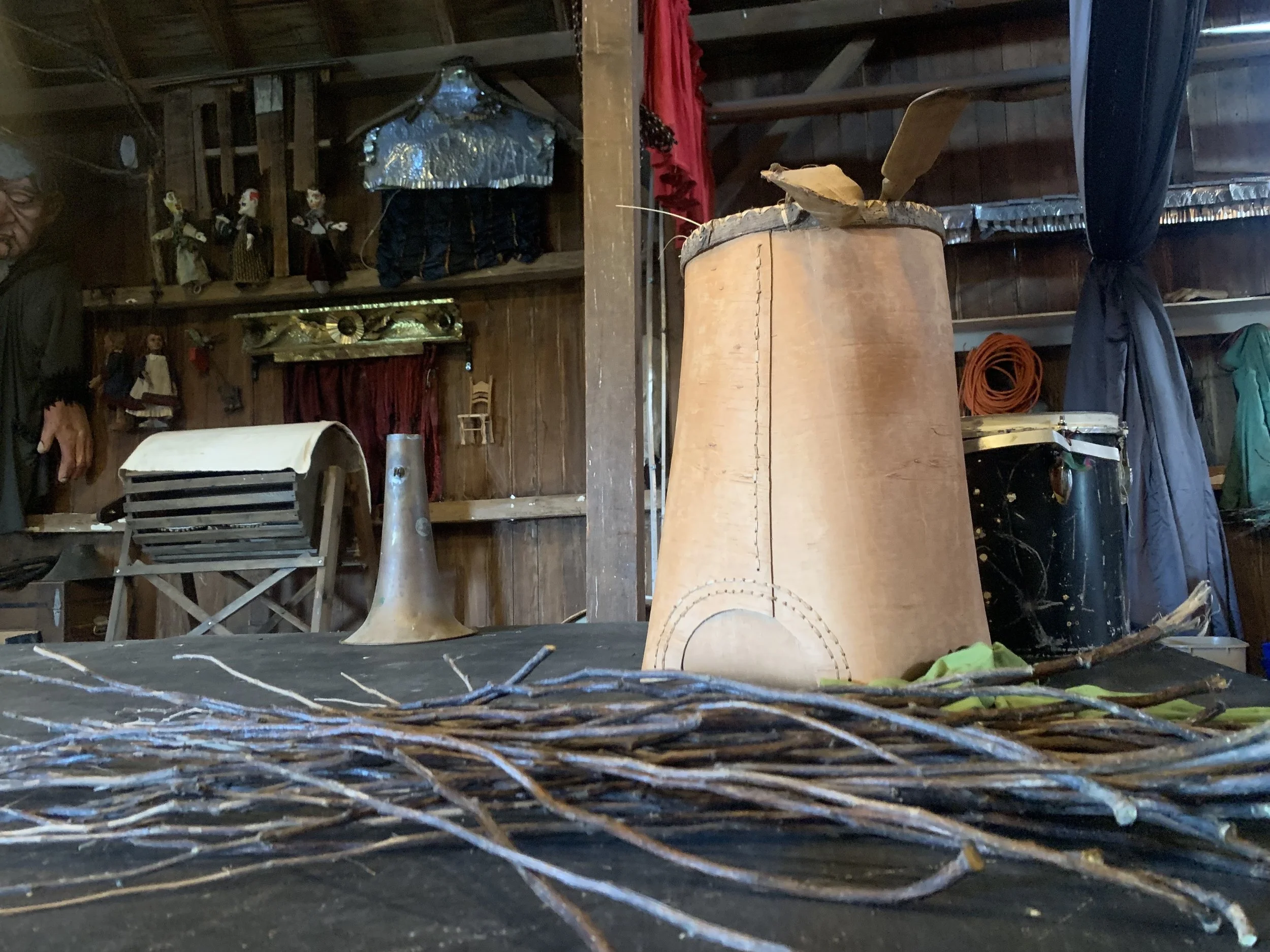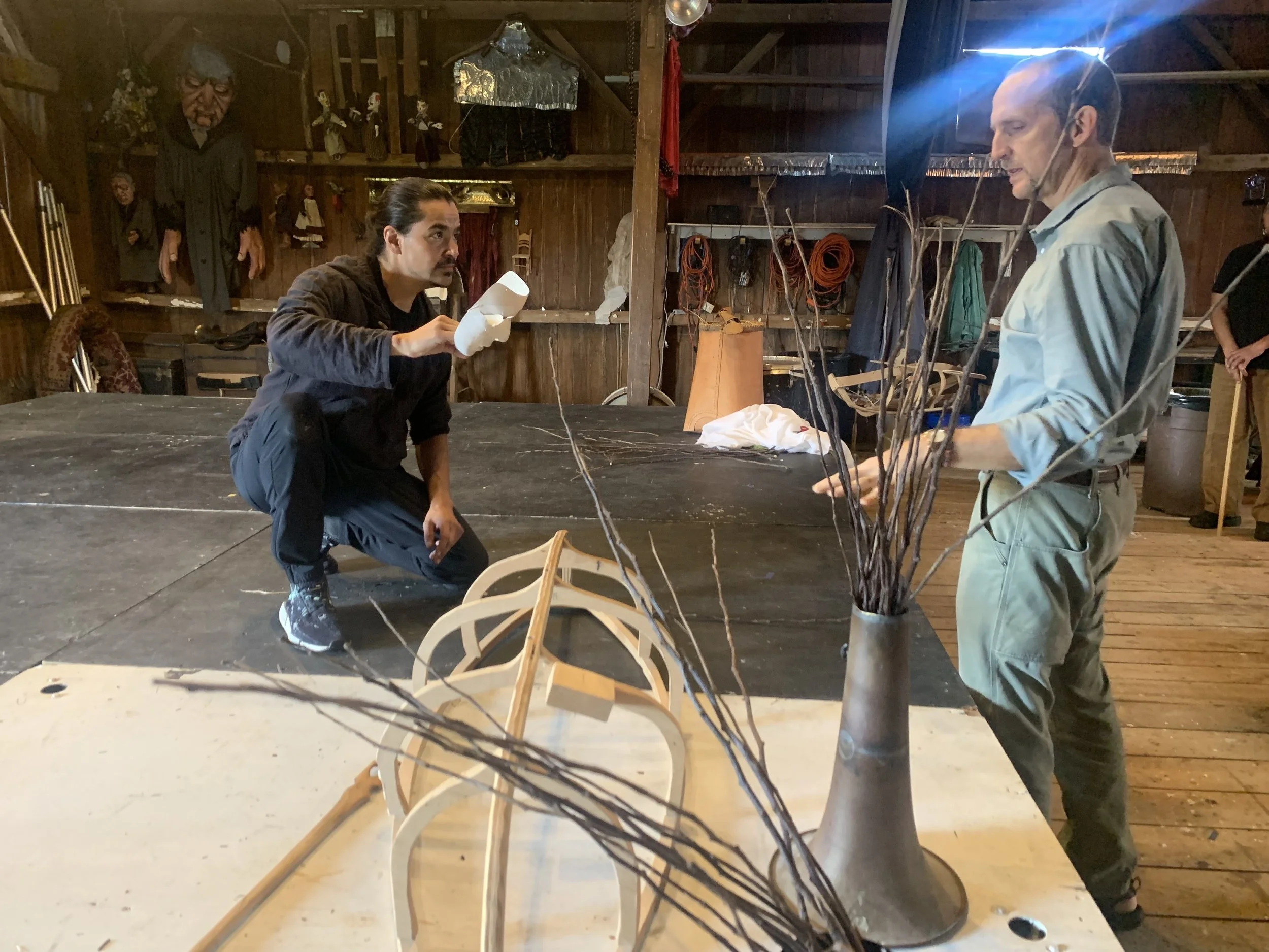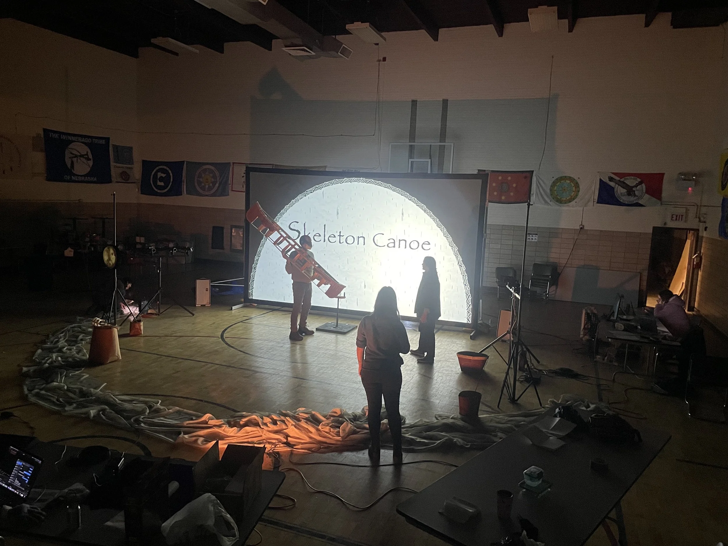 January 29th + 30th 2022 the team came together for the first time to present a work-in-progress of Skeleton Canoe at the American Indian Center of Chicago in partnership with the International Puppet Festival of Chicago. At the workshop, AMR presented the first 30 minutes of Skeleton Canoe as well as a birchbark workshop and community meal. We worked with puppet prototypes, a stand-in set and projection surface, and a small lighting package from the festival to test out design elements. During this time we gained feedback and acknowledgement from the community that we were moving in a good way and permission to continue development.