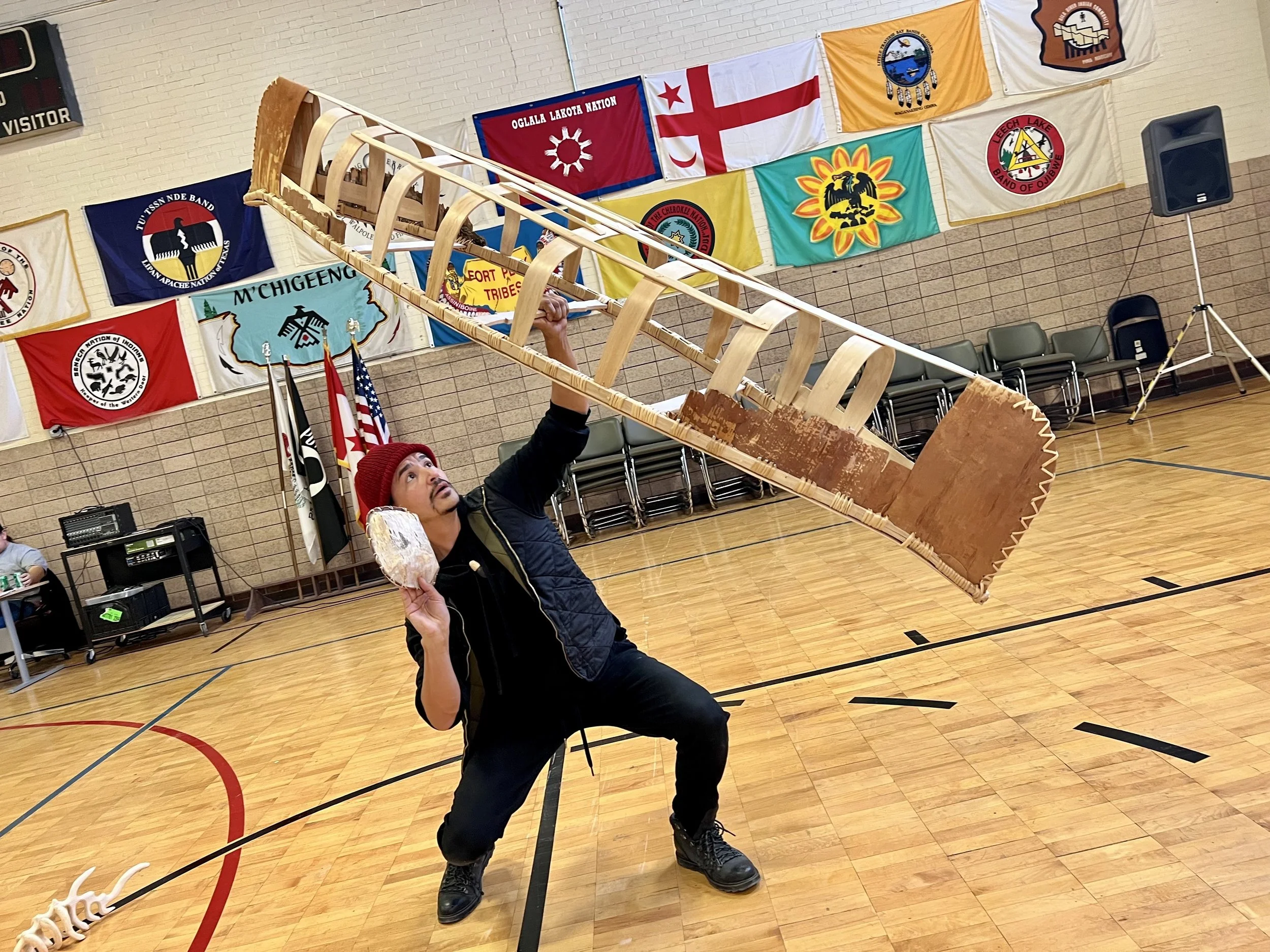In January 2025, Nawbin and Jiimaaan journeyed to Chicago, IL for the world premier of Skeleton Canoe at the Chicago International Puppet Theatre Festival. This amazing experience brought together people of all ages in the packed theatre to witness and join the journey! They were joined by the Great Lakes Lifeways Institute, who offered an amazing series of workshops before each performance and community meals after. On the first night the team was joined by Debra Yepa-Pappan from the Center for Native Futures.